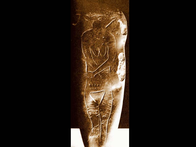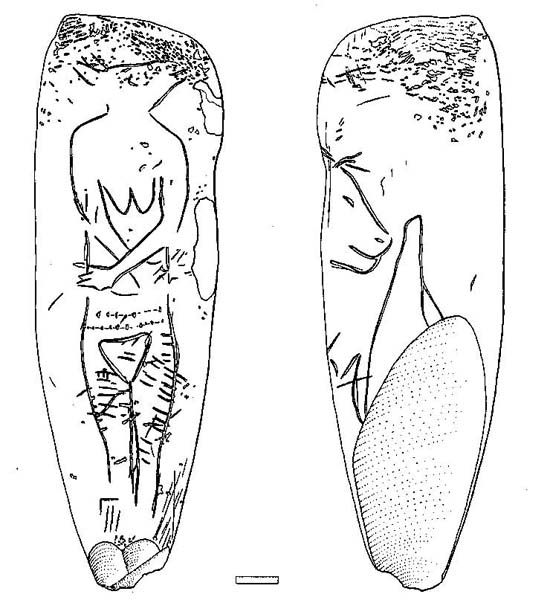 Ciottolo allungato di pietra calcarea-silicea di forma sub triangolare che reca sulla facciata anteriore una incisione antropomorfa, una figura femminile con testa presunta di erbivoro (forse bovide o canide) girata verso sinistra e rivolta verso l’alto, muso allungato con apertura della bocca chiaramente tracciata, due orecchie si sviluppano sul retro della testa, corpo ben disegnato, seni simmetrici e triangolo pubico ben evidente. Nella facciata posteriore vi è incisa l’immagine del muso di un altro animale e la ramificazione di un corno di cervo. Il reperto rappresentava sicuramente una sorta di talismano dal significato rituale-religioso, ma alcune evidenti tracce osservabili alla base del manufatto rivelano anche la sua funzione di utensile.