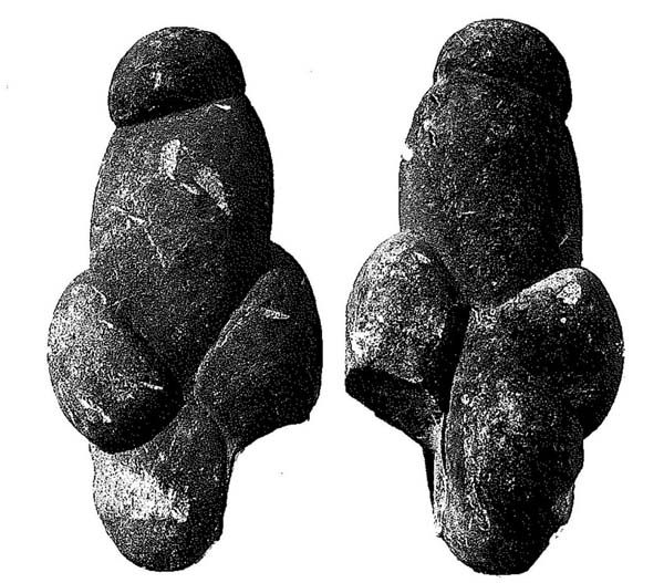 Difficile dire se questo reperto sia un manufatto creato dall’uomo o piuttosto una formazione geologica naturale dalle forme molto evocative (come i botroidi, per fare un esempio). Esso si presenta come un grande ciottolo di arenaria dalle superfici levigate: la calotta in alto appare come una testa abbozzata, i profondi solchi centrali sembrano delineare un triangolo pubico su cui si innestano, lateralmente, delle masse voluminose che ricordano dei fianchi abbondanti. A ben guardare, però, la figura si presenta più come una sorta di commistione tra un corpo femminile molto schematizzato e una rappresentazione fallica. Questa fusione dell’elemento maschile e femminile trova riscontro in altre statuine paleolitiche, come la venere di Savignano, la venere del Trasimeno ma anche la venere rinvenuta nella Grotta di Weinberg presso Mauern, in Baviera. In queste rappresentazioni, come dice la Gimbutas, “il fallo è fuso con il corpo divino della Dea: lungi dall’essere un simbolo osceno, nell’antica Europa il suo significato era probabilmente affine a quello del lingam indiano”. Yoni e Lingam, appartenenti alla più remota preistoria eurasiatica, rappresentano rispettivamente l’organo genitale femminile e quello maschile, simboli di quella dualità cosmica che struttura le diverse forze animatrici dell’universo, sessualità compresa. Ma è soprattutto la loro capacità di generare sempre nuovamente la vita a costituire la loro valenza principale. In particolare, ed è un raffronto che interessa il nostro discorso, vi è una variante simbolica, lo yonilingam, che vede uniti assieme il sesso femminile e quello maschile: il lingam si erge fuoriuscendo dalla yoni, simbolo della sostanza primordiale, matrice cosmica di tutto il reale. Essa lo è, quindi, anche del lingam, assimilato al Pilastro del Mondo attorno al quale si ordina via via tutto il resto del cosmo. Questo genere di statuine, quindi, sembrano avere un’accezione simbolica un po’ diversa rispetto alle “classiche” veneri e potrebbero simboleggiare l’elevazione della forza vitale femminile grazie alla potenza insita nel fallo, in una fusione di matrice cosmogonica.