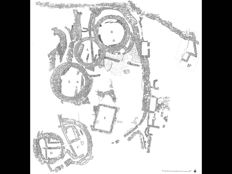 La grande area sacra (fig. 1) è racchiusa da un muro di temenos, cioè il muro che circonda lo spazio sacro separandolo da quello profano, lungo il perimetro interno del quale sono stati realizzati, tra l’VIII e il VI secolo a.C., sei edifici indicati con le lettere da A a F, tutti a pianta circolare, definiti sacelli, ad eccezione dell’ultimo di forma rettangolare. Lo spazio centrale, parzialmente lastricato, viene lasciato volutamente libero, probabilmente per le esigenze connesse allo svolgimento delle attività di culto e di funzioni di tipo rituale, testimoniate dalla presenza di fossette e piccole deposizioni.