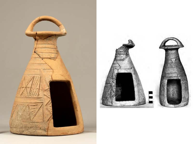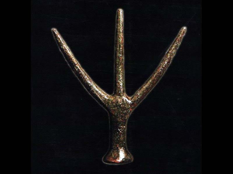 Questi modellini, in associazione con il famoso bronzetto dalla particolare forma “a tridente” (fig. 3), il cui profilo ricorda quello di una figura con le braccia alzate, e con i numerosi tubi fittili o stands, rinvenuti negli strati più anteriori dell’acropoli, richiamano l’attrezzatura di culto dei santuari di origine cretese della Tarda Età del Bronzo o della prima età storica, chiaramente dedicati alla Dea Madre, l’antica divinità minoica della natura.
