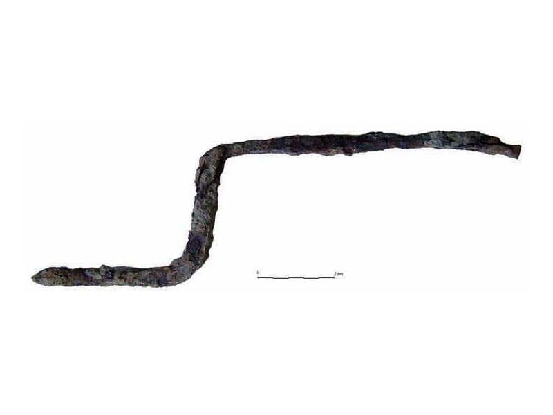 Un oggetto particolarmente interessante rinvenuto nei sacelli B e D è la “chiave di tempio” in ferro (fig. 5): queste chiavi, tipiche dei santuari ellenici dedicati a divinità femminili, sono infatti rappresentate, in alcune pitture vascolari, nelle mani delle sacerdotesse delle dee Atena ed Artemide. In assenza di tracce di sistemi di chiusura nelle soglie dei sacelli, sono state considerate come oggetti rappresentativi dello status sacerdotale femminile o come doni votivi da parte delle partorienti. La loro presenza in contesti indigeni è unanimemente interpretata come il prodotto di intensi rapporti tra greci e popolazioni autoctone, mediati e propiziati dalle donne, alle quali viene riconosciuto un ruolo attivo e importante nel creare relazioni tra le popolazioni autoctone e le colonie greche, anche attraverso la condivisione di comportamenti rituali e il riconoscimento e l’accettazione di piani comuni tra le divinità indigene e quelle greche.