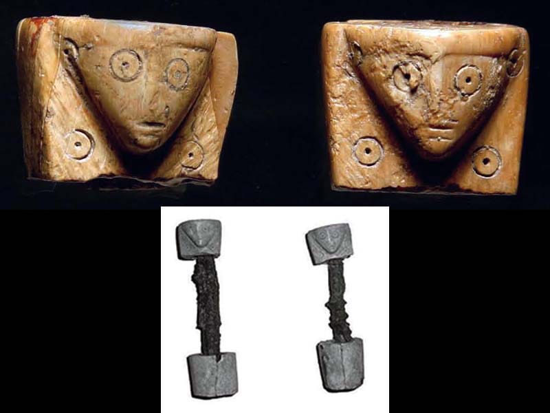 Non mancano, però, in questo sacello deposizioni legate al mondo femminile quali, oltre alla citata “chiave di tempio”, la doppia palmetta di grandi dimensioni in avorio e ambra (fig. 6), oggetto unico nel panorama della Sicilia arcaica, forse ornamento di un mobile ligneo o di uno scrigno che rimanda all’uso, documentato nelle raffigurazioni vascolari, di offrire alle divinità femminili cofanetti colmi di doni votivi in occasione delle nozze; la coppia di testine (fig. 6) in avorio, con anima in ferro e dal volto triangolare dalle spiccate caratteristiche dedaliche, sul quale gli occhi sono resi da due cerchielli impressi campiti da un puntino al centro, molto probabilmente la rappresentazione di figure femminili di natura divina. La resa dei dettagli, che richiamano gli oggetti di ornamento personale sopra descritti, riconduce a un tipo di fabbricazione certamente locale.