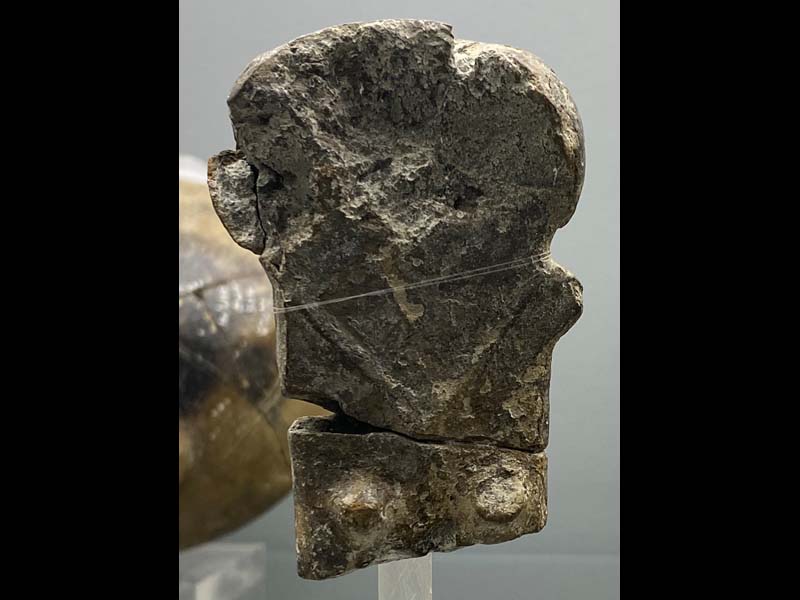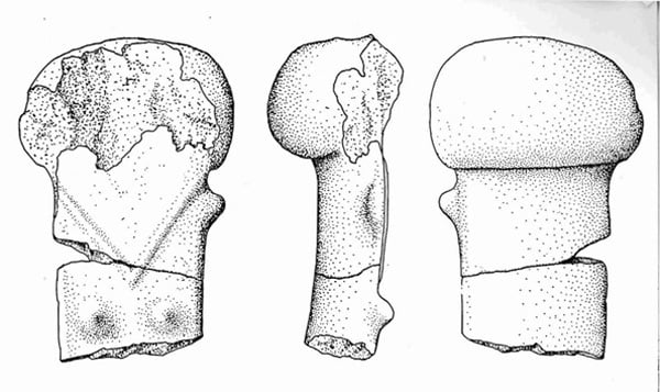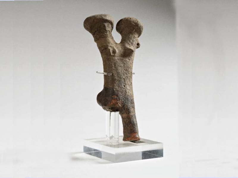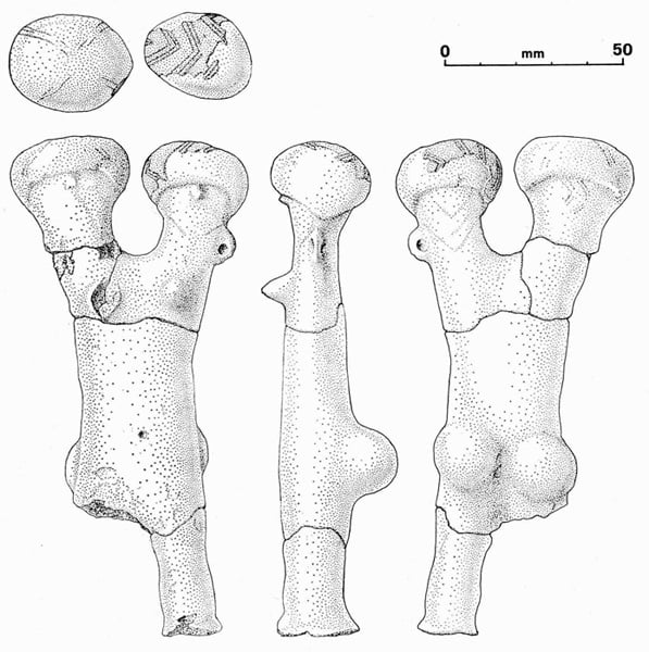 Si tratta di una statuina femminile con due teste su un unico corpo. Le braccia, di cui una mancante, sono rese con un piccolo occhiello laterale non completamente forato; le gambe cilindriche, di cui la destra è mancante, terminano con una leggera svasatura a “zampa d’elefante”. Le natiche sono molto evidenziate ed in misura minore i seni, mentre un piccolo foro indica l’ombelico. Le teste hanno una forma a “fungo” con due piccole protuberanze che indicano i nasi. La figurina è modellata a mano, in argilla grigio giallastra con qualche raro frammento di quarzo nell’impasto, rivestita di un sottile strato d’argilla levigata che si è conservato solo sulla testa sinistra ed in ampie zone della parte inferiore del corpo; superficialmente si presenta di colore nerastro, mentre nello strato più profondo è di colore rosso mattone. La decorazione è ottenuta a graffito o ad incisione sulla parte superficiale, solo alcune tracce si sono conservate anche nell’impasto sottostante, in generale quando il solco è particolarmente profondo, ma quasi ovunque il deterioramento della parte superficiale nera ha compromesso la leggibilità dei motivi ornamentali che vi sono incisi. Sulle teste vi sono motivi decorativi a “V”, interpretati come dettagli dell’acconciatura. Idoli bicefali sono noti nell’area balcanica (figura bicefala a testa di uccello dell’insediamento di Vinca, figura bicefala da Gomolava nel nord della Jugoslavia), in Romania (doppia figura maschile e femminile da Gumelnita, connessa dalla Gimbutas al rituale delle nozze sacre), in Siria (immagine bicefala da Tell Brak) ed in Turchia (immagine femminile bicefala di Catal Huyuk).