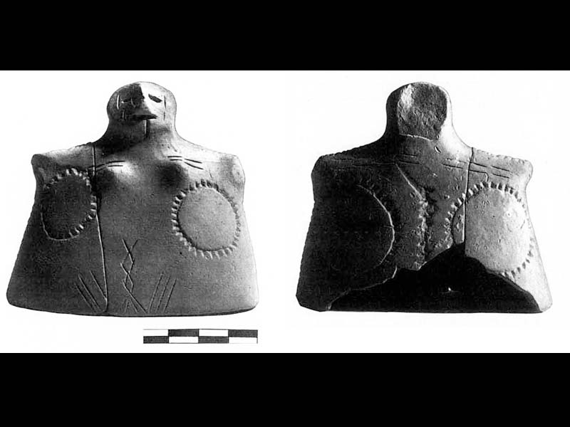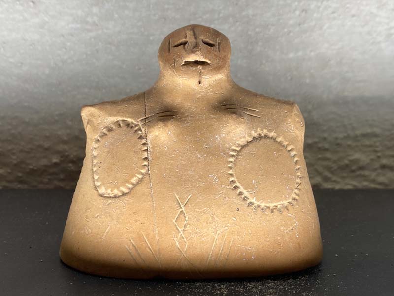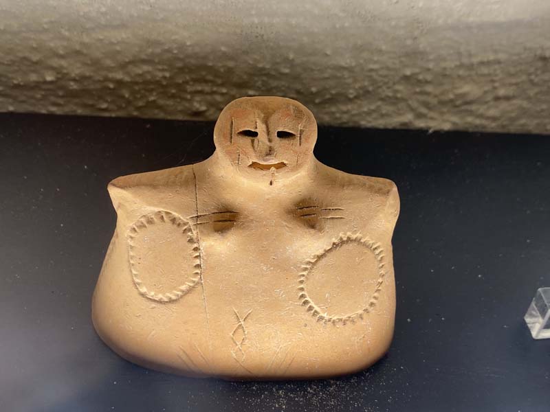 Sulla parte anteriore del corpo due piccole protuberanze coniche sono a rappresentare i seni, mentre ai lati sono disposte 2 forme circolari dentellate del diametro di circa 2 cm. presenti anche sul retro della statuina che potrebbero essere accomunate al simbolo solare, relativamente diffuso nell’ambito degli schemi decorativi del Neolitico.