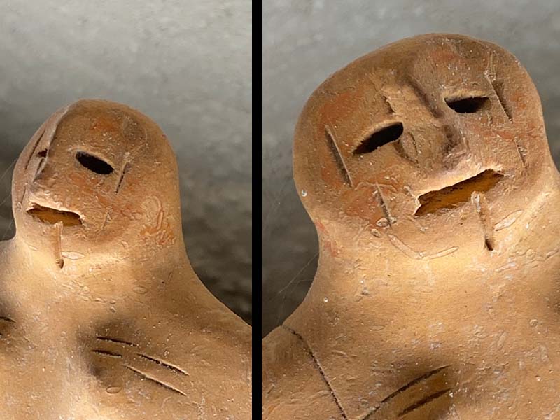 Il volto ha i connotati di una maschera, con gli occhi e la bocca resi da brevi tratti orizzontali impressi, il naso in rilievo appuntito che prosegue fino all’altezza della fronte mentre due tratti verticali sono posizionati alle estremità del volto come ad indicare una probabile acconciatura. Il retro del capo non ha alcun segno ma si presenta lacunoso per una piccola scheggiatura. In generale, la statuina ha molte affinità con quella di Passo di Corvo, sia per la resa del volto che per i caratteri simbolici rappresentati sul corpo (nel caso di Passo di Corvo sono da evidenziare i motivi a farfalla presenti al di sotto dei seni ed interpretati come attributi della divinità raffigurata); invece, nell’ambito della produzione figurativa neolitica orientale, la statuina di Canne ha affinità con quelle dei Balcani centrali di Vinca o di Butmir per via dell’impostazione rigida del corpo, testa a maschera e schema decorativo prevalentemente geometrico.