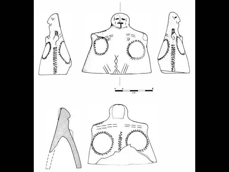 Sempre sulla parte anteriore, nella parte bassa è incisa una figura antropomorfa costituita da un motivo a doppia losanga con terminazione cornuta impostata su motivo a triangolo con linea doppia ed ai lati tre linee oblique per parte ad indicare probabilmente le mani; il dettaglio della figura antropomorfa con appendici cornute e braccia rivolte verso l’alto è riscontrabile in numerosi esemplari neolitici di decorazioni di ceramiche (come a Lama Marangia in Puglia) e di pitture in grotta (come gli antropomorfi di Porto Badisco in Puglia o di Grotta di Levanzo in Sicilia), quasi a rappresentare un simbolo consolidato di divinità o con particolari attitudini sciamaniche, rafforzando dunque la valenza cultuale del pezzo.