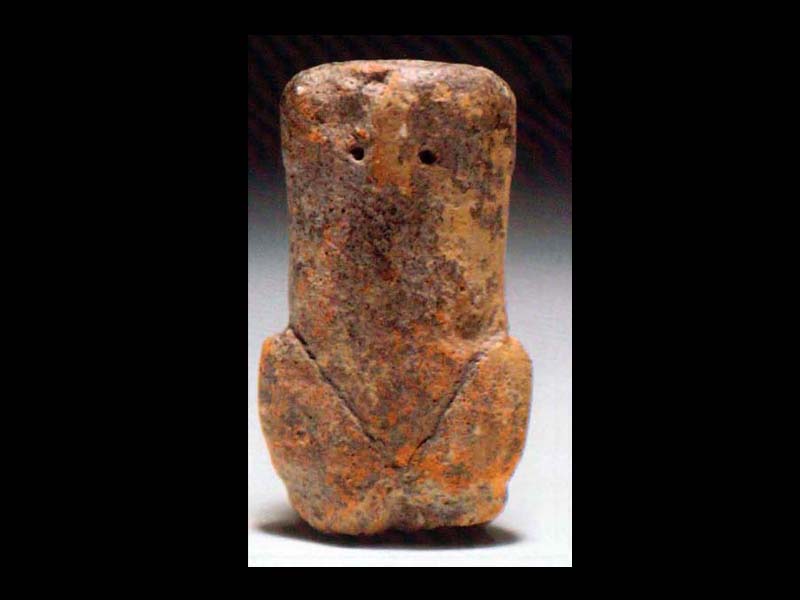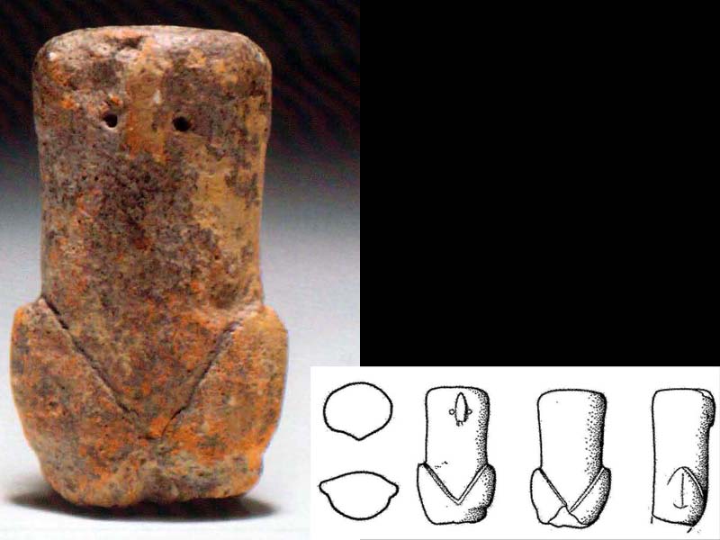 “Le statuine fittili sono tutte di argilla figulina e molto frammentati. Fra le più interessanti è quella rinvenuta nella capanna 8 ed è un grosso cilindro leggermente appiattito ricoperto da sottili striature irregolari e con due coppie di sottili linee incise che si incontrano ad X su una faccia; un’altra fu rinvenuta nella capanna 9 ed è formata da un grosso nastro ricurvo con espansione conica alla base dove erano poste due piccole bugne coniche simmetriche.” (da Giuliano Cremonesi, 1965).