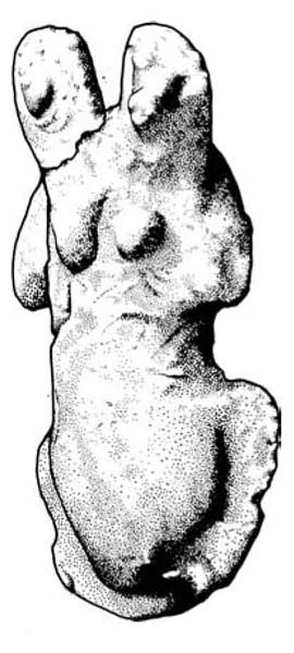In realtà dalla foto della statuina della capanna 8 riportata a pagina 34 del saggio di Fugazzola e Tinè – a cui ci stiamo riferendo nel nostro scritto – il segno è chiaramente una V e non una X, “… graficamente il modo più diretto di rendere il triangolo pubico… Quest’espressione e il suo riconoscimento sono universali e immediati, ma è nondimeno sorprendente quanto presto tale tratto “stenografico” si sia cristallizzato per diventare, attraverso innumerevoli ere, il marchio distintivo della Dea Uccello.” (da Marija Gimbutas, 2008, pag.3). E in realtà la statuina rivela una sorprendente somiglianza con l’immagine di un uccello e il profilo stilizzato rivela una prominenza tipo becco.